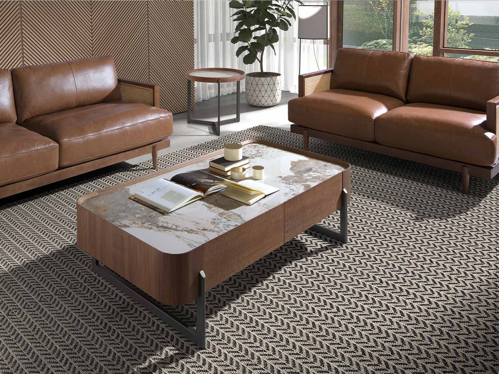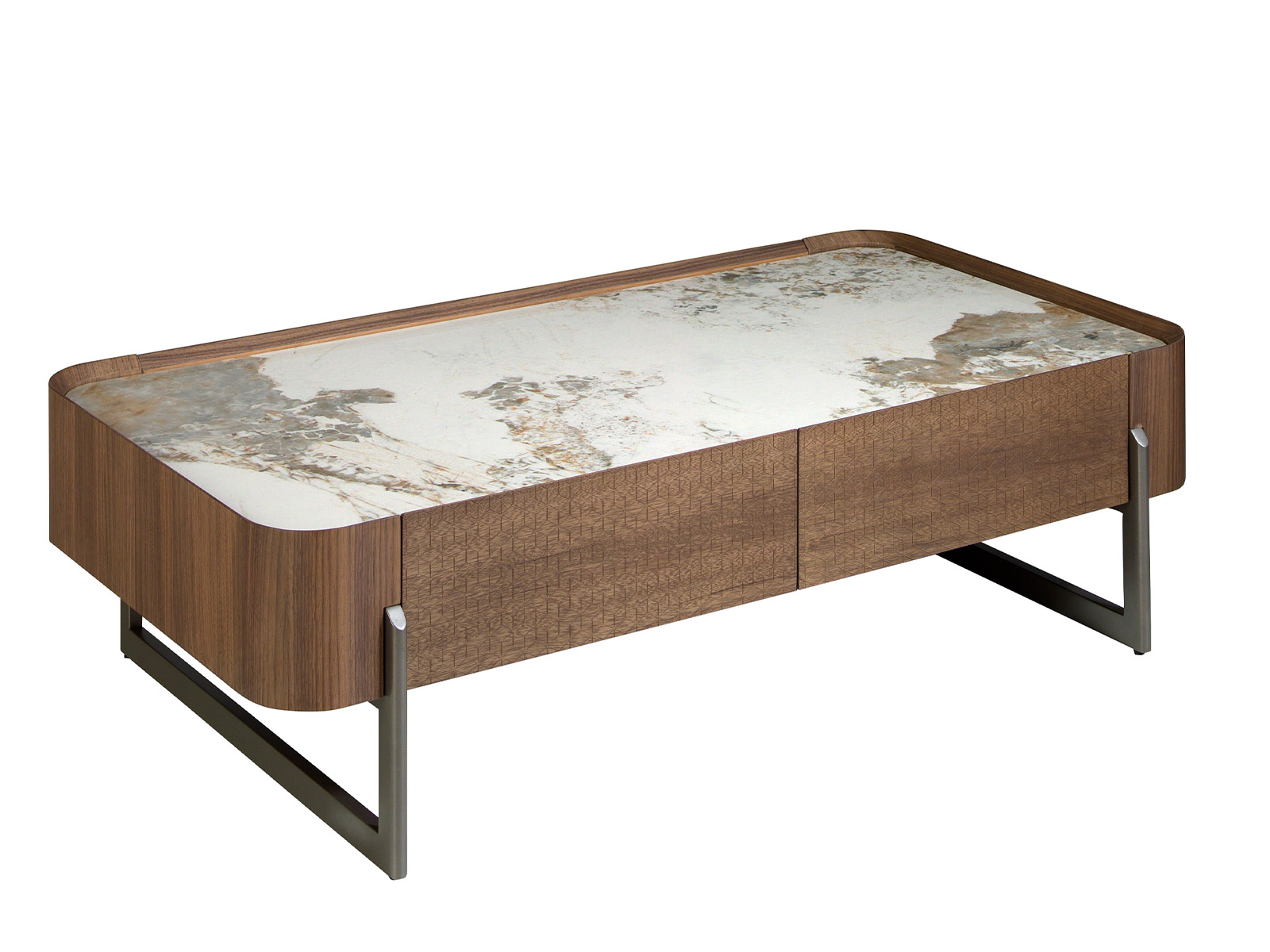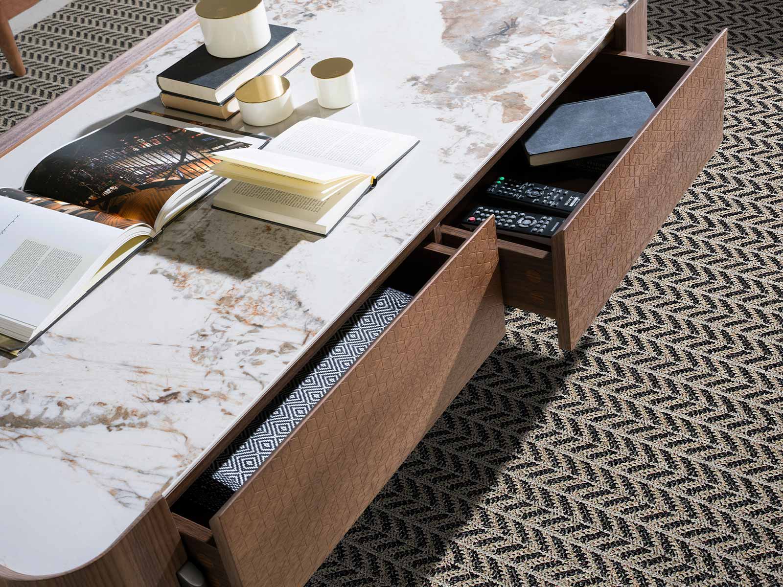 Mesa centro rectangular de diseño moderno fabricada en madera chapada en nogal natural y una elegante tapa de mármol porcelánico blanco con vetas en tonos tierra en acabado brillo. Su estructura de patas de acero inoxidable oscuro metalizado, aporta el toque de modernidad y vanguardia que busca para su hogar. Cuenta con un amplio espacio de almacenaje con 2 cajones con sistema de apertura uñero y cierre soft-closing. Para más información o consultas personalizadas, no dudes en ponerte en contacto a través del formulario.