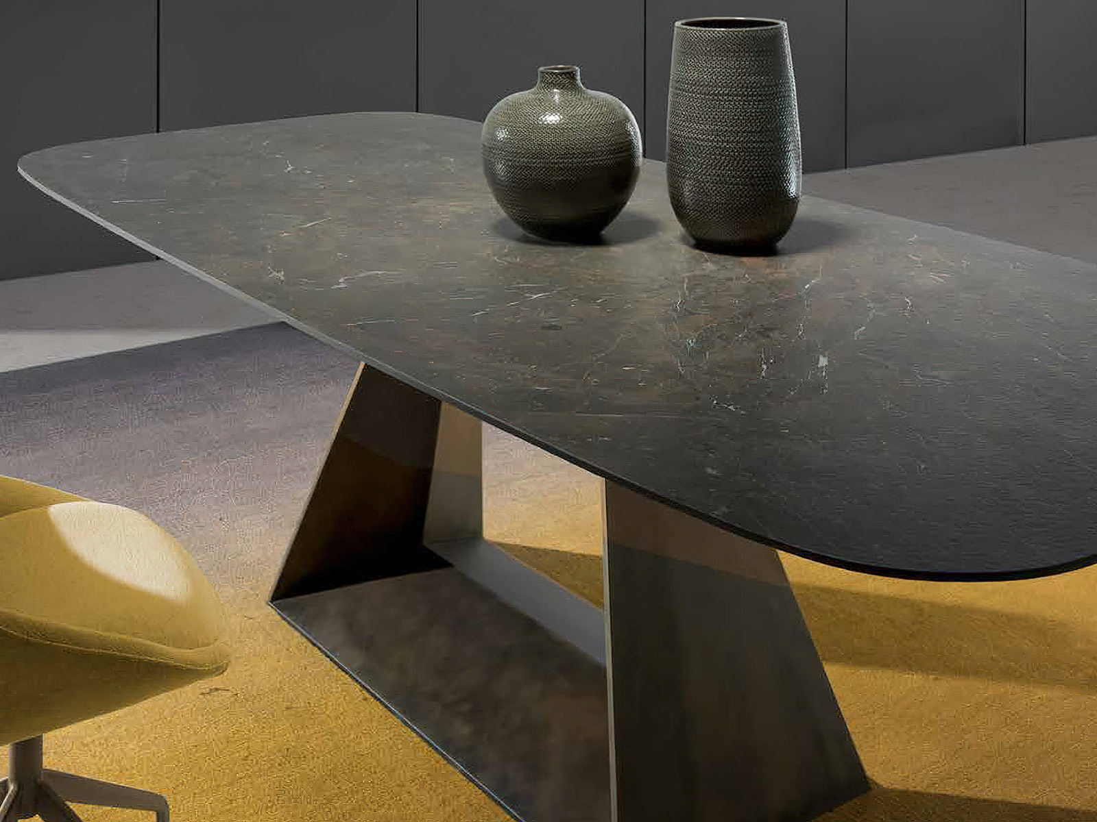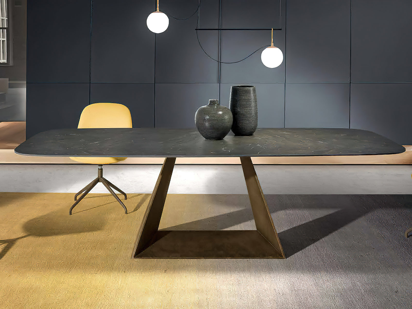 Eleva tu espacio de comedor con esta mesa, una pieza que encapsula la elegancia contemporánea. Con su diseño minimalista y sofisticado, la mesa presenta una superficie ovalada en un acabado negro mate que aporta una presencia discreta pero impactante. La base de la mesa, con su forma geométrica triangular invertida, no solo es un soporte estable sino que también sirve como un elemento artístico en su hogar. Ideal para reuniones íntimas o como declaración de estilo. Disponible en varios acabados y medidas, la tapa de porcelánico da personalidad a esta mesa de comedor tan especial