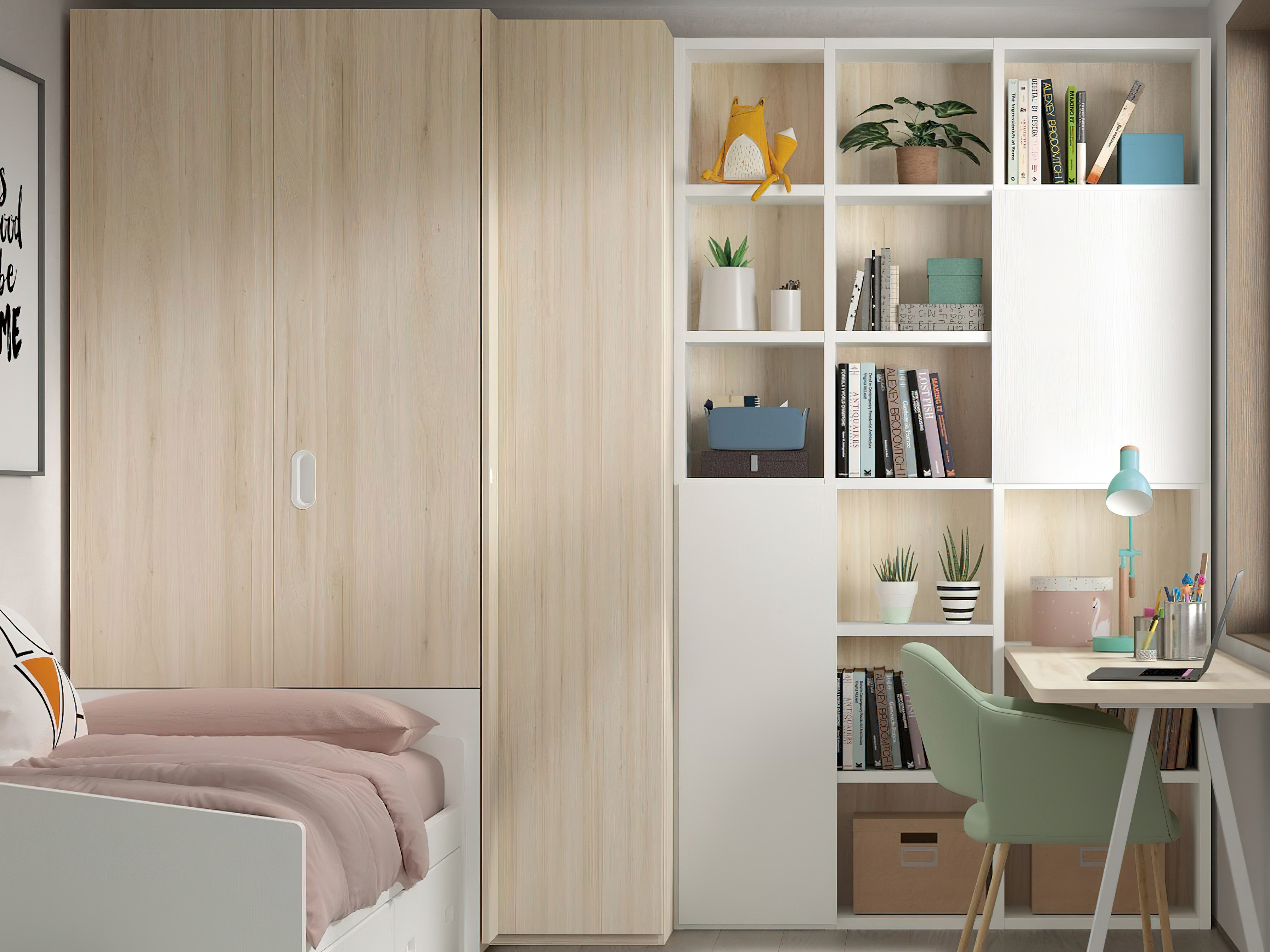Descubre la fusión perfecta de estilo y funcionalidad con esta estantería hecha a medida y el este armario diseñado y adaptado a esta habitación, ideal para aprovechar a máximo el espacio en una habitación. Con diseño abierto y versátil, compartimentos de diferentes tamaños para una organización optima y con acabados de calidad. Al usar colores claros, le damos mas amplitud a esta habitación, esta colección de muebles ofrece muchos colores y medidas para crear el ambiente perfecto.