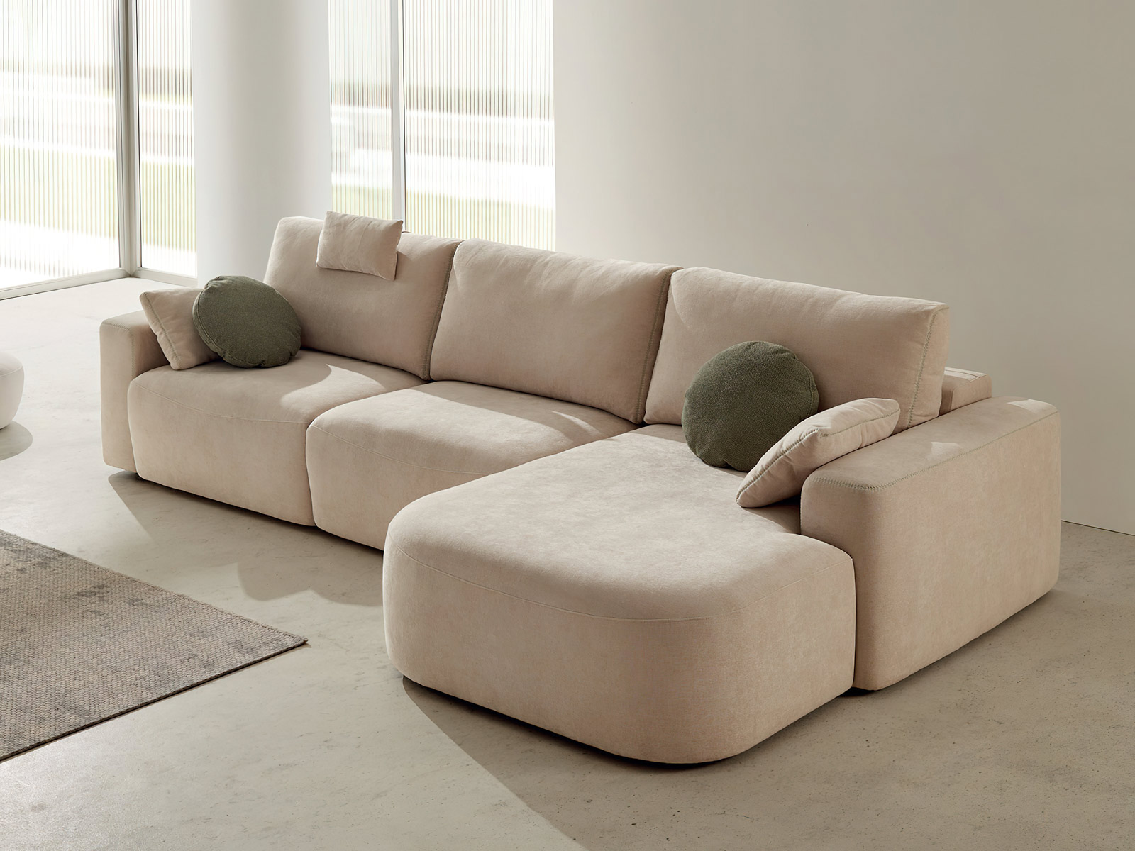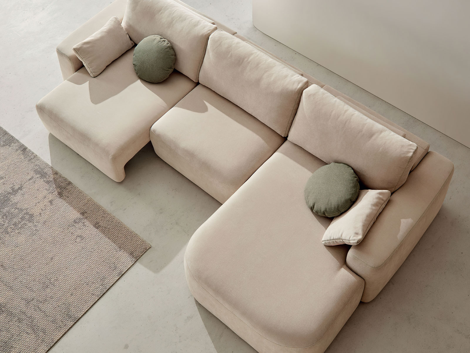 Cada detalle ha sido cuidadosamente considerado, desde los cojines redondos que proporcionan un contraste sutil y una comodidad adicional, hasta las líneas limpias y la forma que se integran armoniosamente en su hogar.