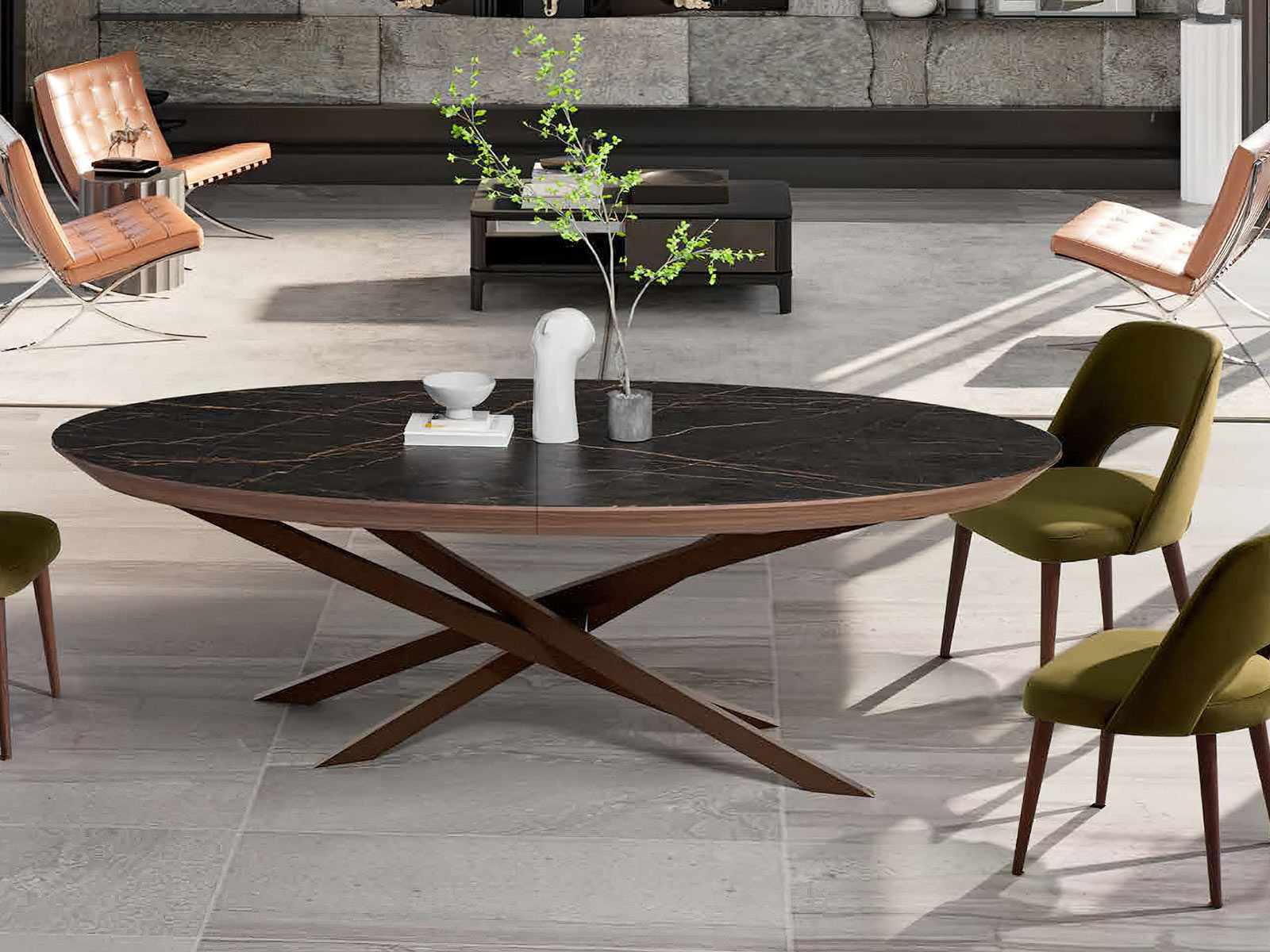 Mesa de comedor con una superficie ovalada y extensible de porcelánico, destacando por su veteado natural y acabado pulido que le confiere un aspecto lujoso y sofisticado. El soporte de la mesa es una estructura entrecruzada de madera, creando un interesante contraste con el mármol y añadiendo estabilidad al diseño. La combinación de materiales naturales y la forma geométrica del soporte hacen que esta pieza sea no solo funcional sino también un punto focal decorativo en cualquier habitación. Disponible en varias medidas y colores